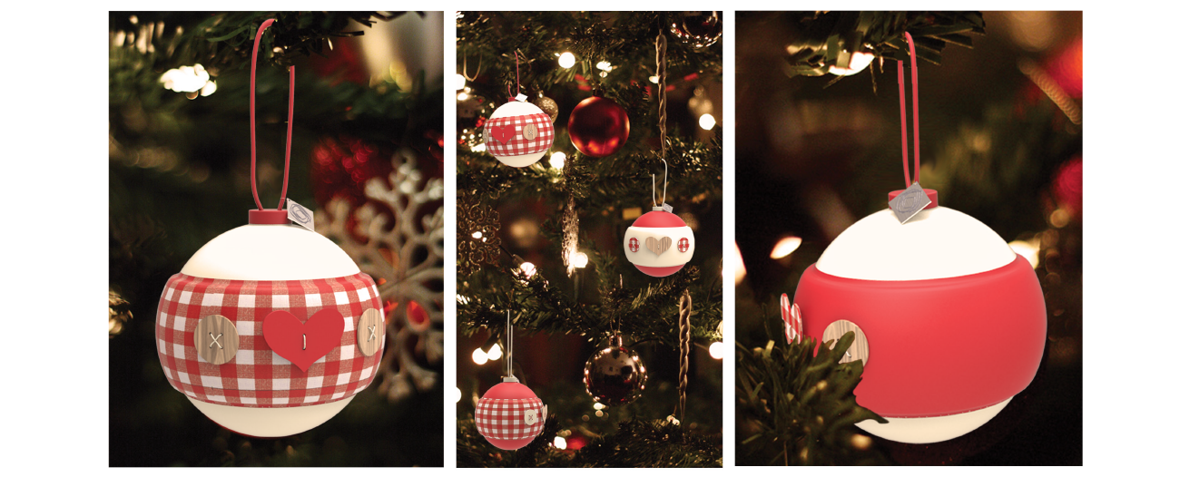 These decorations feature a fabric band that is wrapped around a shiny ceramic bauble, as well as three buttons.